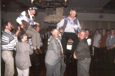 Doch anders als in anderen Dörfern senkt sich in Müggenkrug nicht die Erntekrone über dem Paar. In Müggenkrug wird per Los entschieden, wer den Titel bekommt. Bereits vorher wird eine Nachbarschaft ausgeguckt, aus deren Mitte das Erntekönigspaar stammen soll. So gab’s auch in der Nachbarschaft der Janssen’s fünf Bewerber. Dem 97er Königspaar stehen nun etliche Verpflichtungen ins Haus. So müssen sie zum Beispiel die Erntefeste in der Nachbarschaft, wie Ardorf und Leerhafe, einen Besuch abstatten. Aber auch das vergangene Wochenende hat es schon in sich gehabt: Am Sonnabend ging’s erst nach fünf Uhr ins Bett, und auch die netten Nachbarn wollten mit Spiegeleiern bewirtet werden.